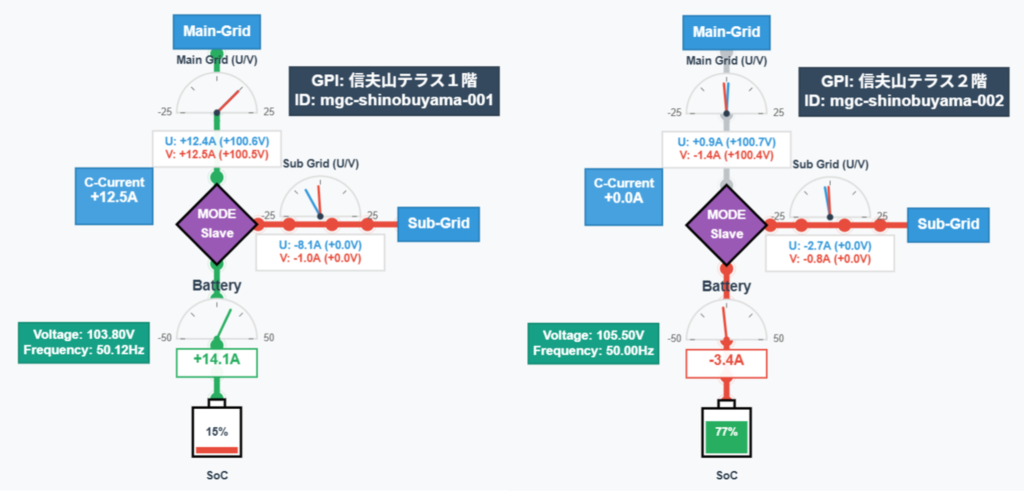1階と2階にそれぞれGPIと蓄電池のシステムを配置し、系統との連携や停電時に系統から分離してグリッド内に電力供給、またグリッド間の電力融通を実現しました。蓄電池の残量や電力消費はリアルタイムでモニターされ、ログデータはダッシュボードとして履歴を確認できます。(下図)